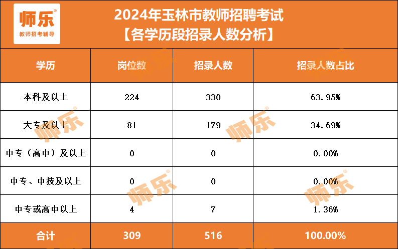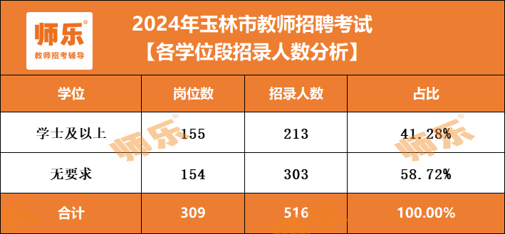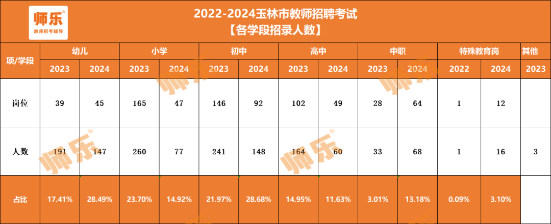 2024年玉林市招聘中小幼教師516人,招錄總?cè)藬?shù)是近六年新低。從歷年的招錄情況來看,從2021年開始招1286人到2024年逐年在下降,會出現(xiàn)這樣的情況,極大可能是教師崗位已經(jīng)飽和,還有一個原因是,自2020年以來自主招聘的實行及校招等招聘動作,一定程度上也稀釋了統(tǒng)招的招錄人數(shù)。綜上所述,崗位趨向飽和,統(tǒng)招人數(shù)減少,上岸要趁早。
