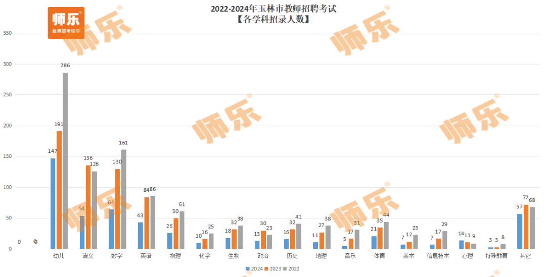 (2)2024年玉林市教師統(tǒng)招整體縮編,各學(xué)科招錄人數(shù)都有所減少,其中招聘人數(shù)減少的最明顯的學(xué)科是語文跟數(shù)學(xué)。語文學(xué)科從去年招錄136人,今年招錄54人;數(shù)學(xué)學(xué)科去年招錄130人,今年招錄64人。所以今年想要報考這兩門學(xué)科的小伙伴可要好好準(zhǔn)備了,狼多肉少強者上。競爭會有多激烈相信大家都心中有數(shù)了。